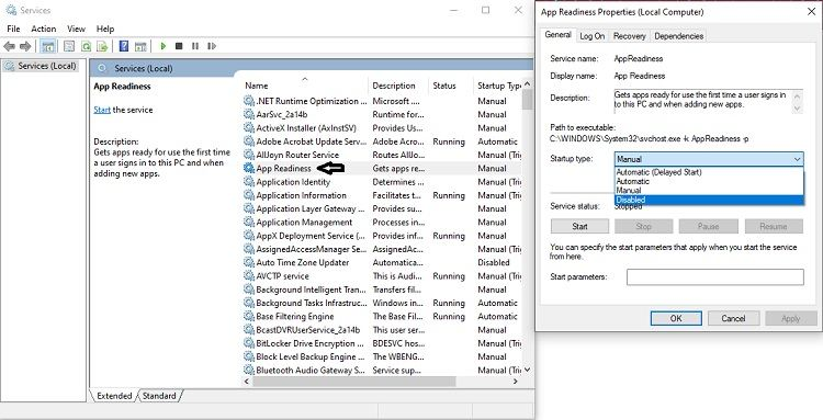 - 「スタートアップの種類」オプションをクリックし、ドロップダウン メニューから「無効」をクリックして先に進みます。